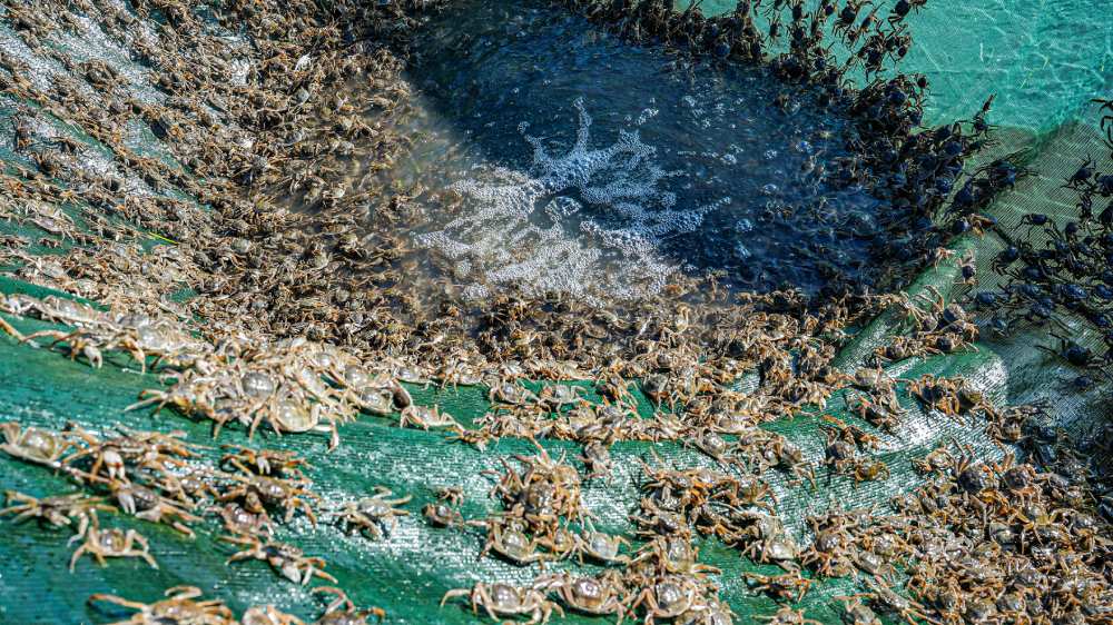 在阳澄湖现代农业产业园中华绒螯蟹“阳澄湖1号”培育基地,工作人员一大早就开始从蟹苗塘里打捞起一筐筐大小不一、个头健硕的蟹苗送进基地工场,由三、四十名工作人员按规格、质量现场分拣、挑选,然后一只只装袋入筐,再称重加冰块搬运到早已等候在停车场上的运输车上。据负责人介绍,该工场每天多则上万斤,少则数千斤蟹苗都要装车运往阳澄湖周边的养殖池塘,“阳澄湖1号”蟹苗也成为当地养殖户抢手的“香饽饽”。