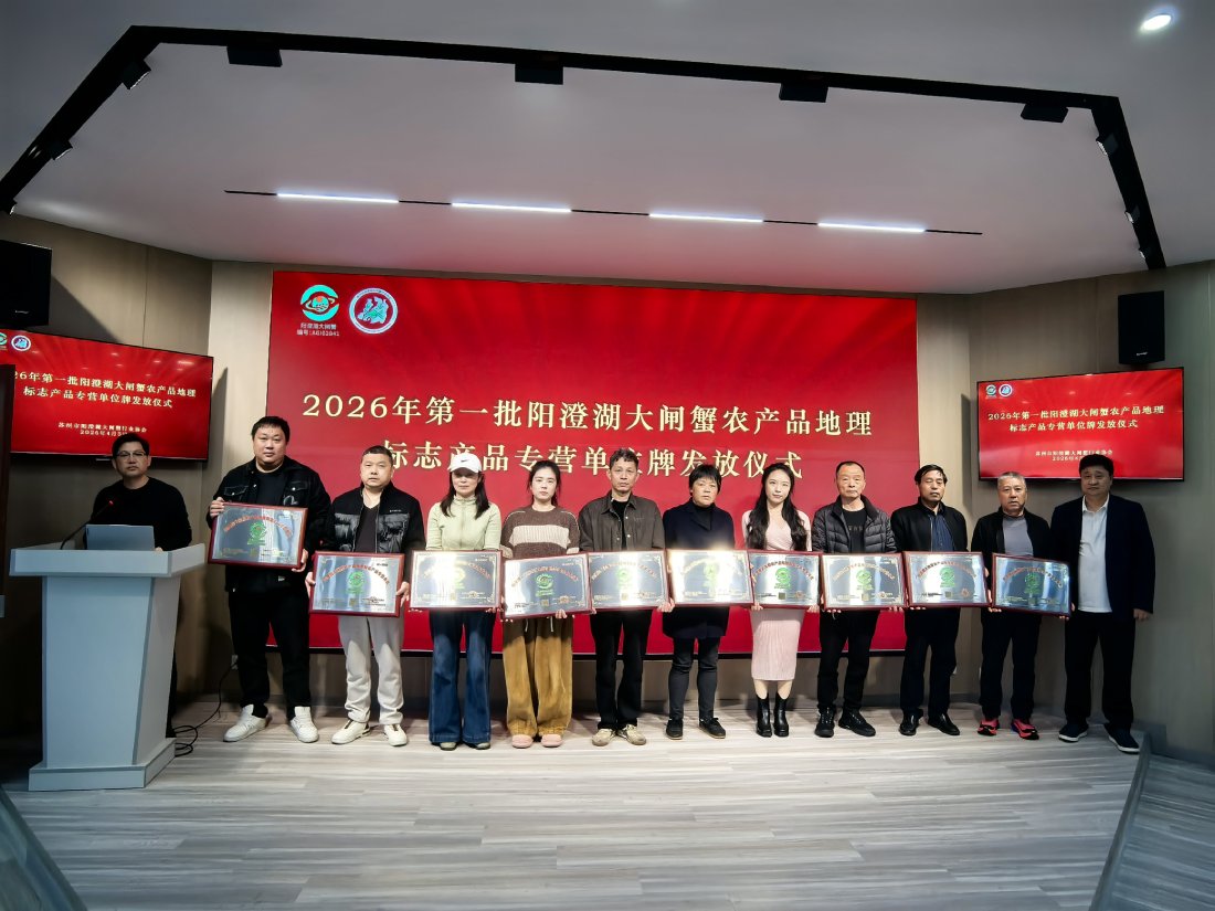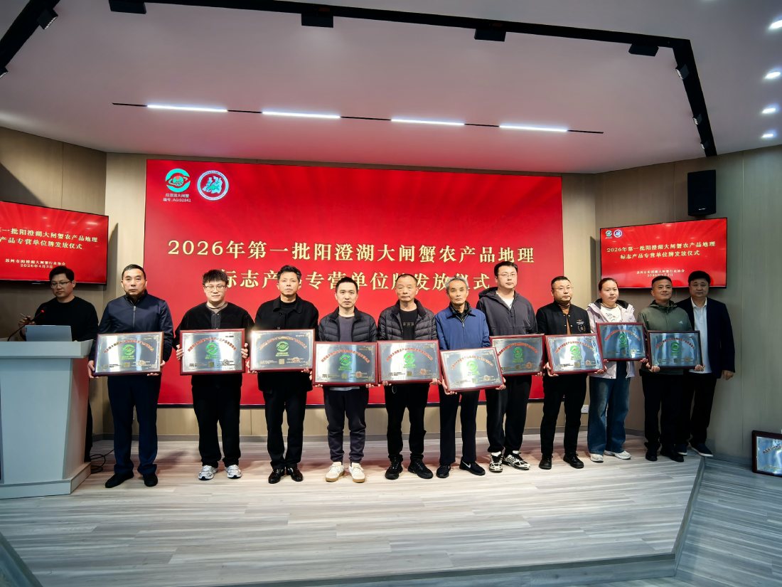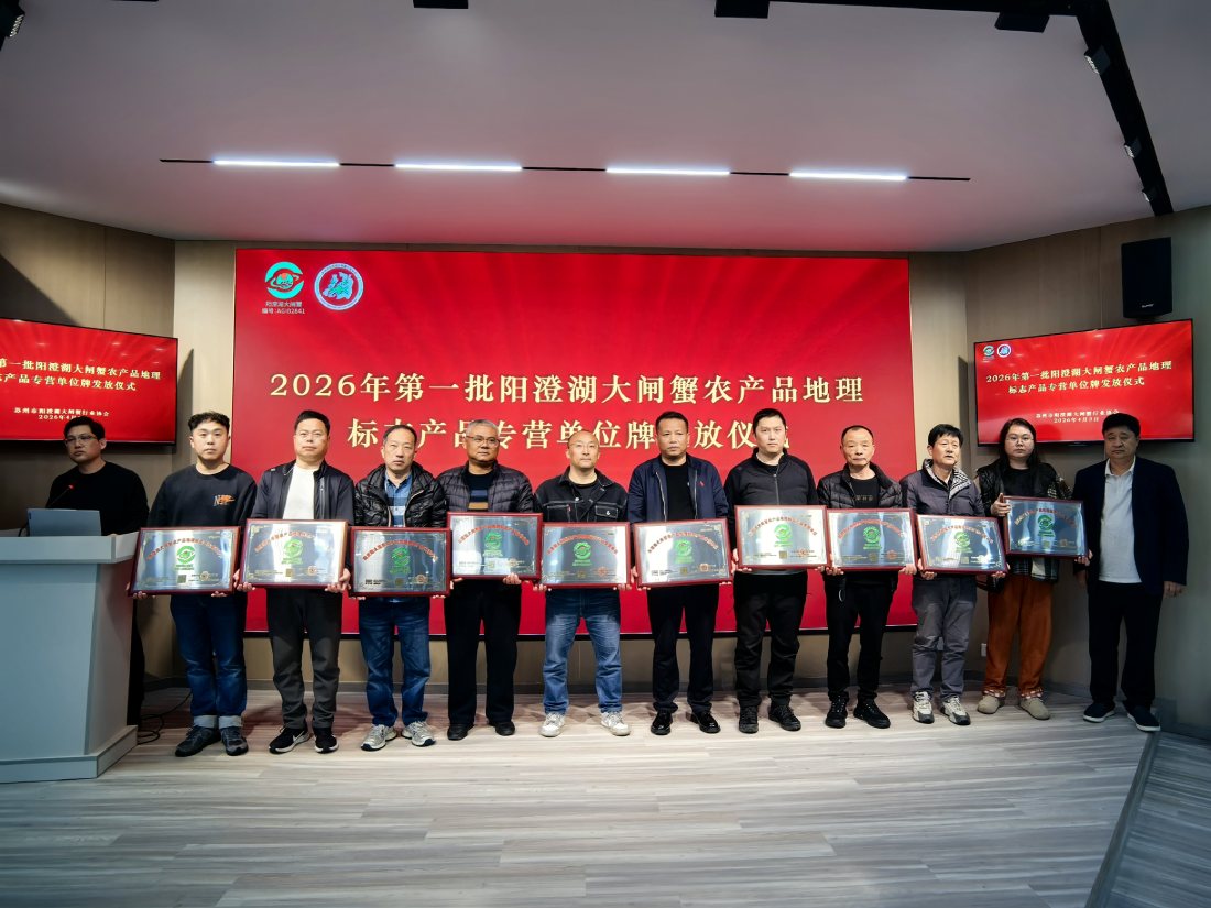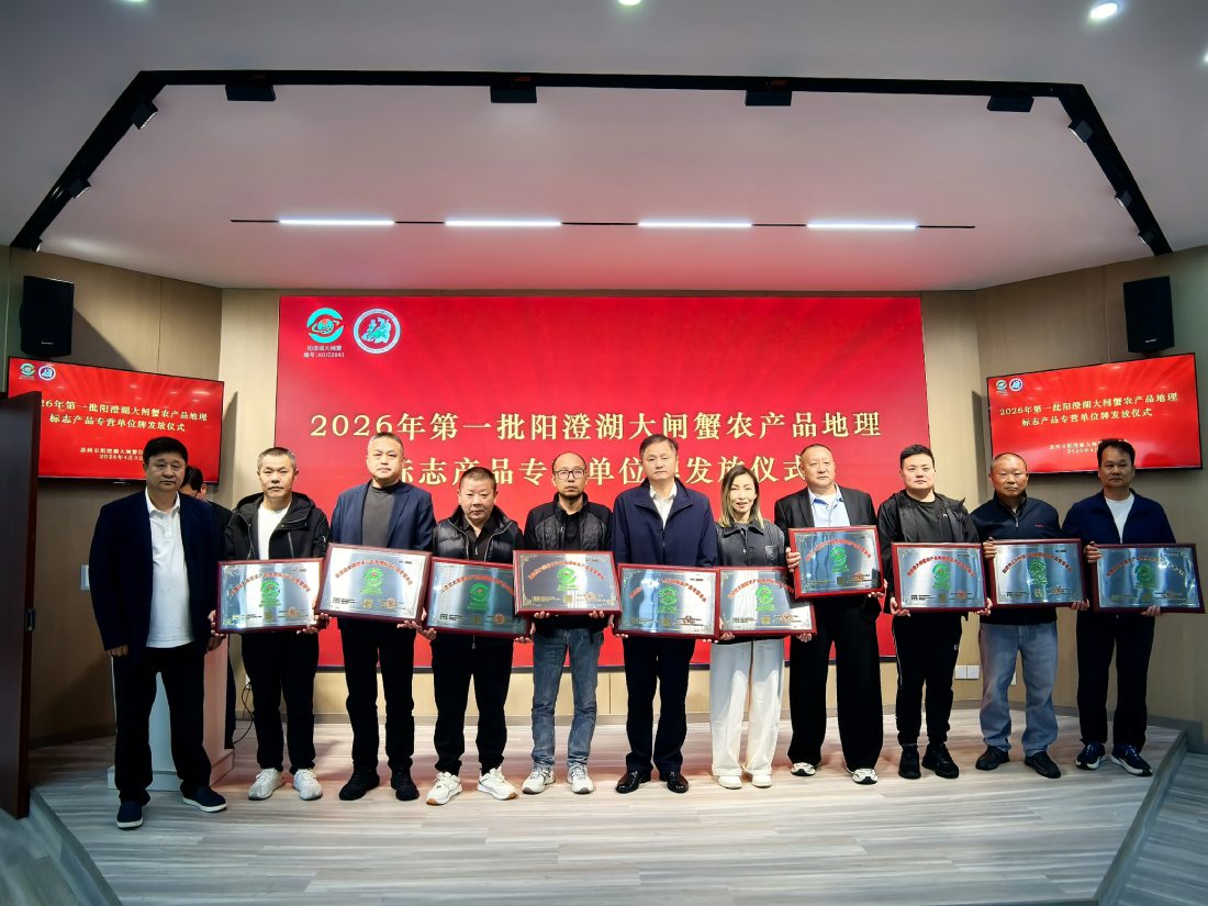 4月3日下午,苏州市阳澄湖大闸蟹行业协会在报告厅举行2026年第一批阳澄湖大闸蟹农产品地理标志产品专营单位牌发放仪式,仪式由协会秘书长陆彬主持。协会2026年轮值会长张全根为第一批经协会审核通过的40家会员单位颁发了阳澄湖大闸蟹农产品地理标志产品专营单位牌,并一起合影留念。