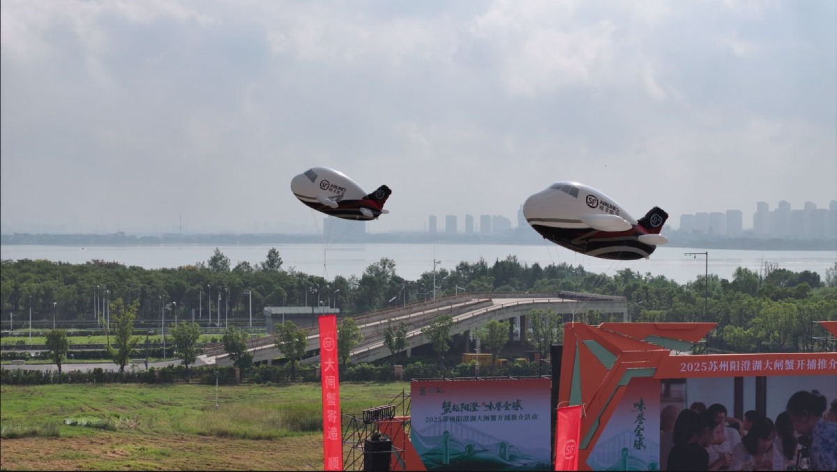上午10点,开捕启动仪式将现场气氛推向高潮。接着,由一群水乡蟹嫂带来的阳澄渔歌保留曲目《卖蟹谣》,以其朴实、感人、亲切的风格赢得了现场观众的热烈掌声。在万众瞩目下,场内嘉宾和场外观众通过直播镜头共同见证今年第一篓阳澄湖大闸蟹出水时刻,金色晨曦中蟹农把蟹笼扬起,一只只肥美鲜活的大闸蟹争抢爬行,丰收喜悦感染全场。随后,无人机编队将首批大闸蟹精准空运至主舞台,展现“低空经济+传统蟹业”的创新融合。现场还通过直播镜头,全景展示专卖店标准化作业流程——从捆扎、包装到冷链运输,每一个环节都彰显出阳澄湖大闸蟹产业链的精细化与专业化,让消费者买得放心、吃得安心。