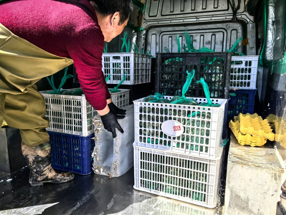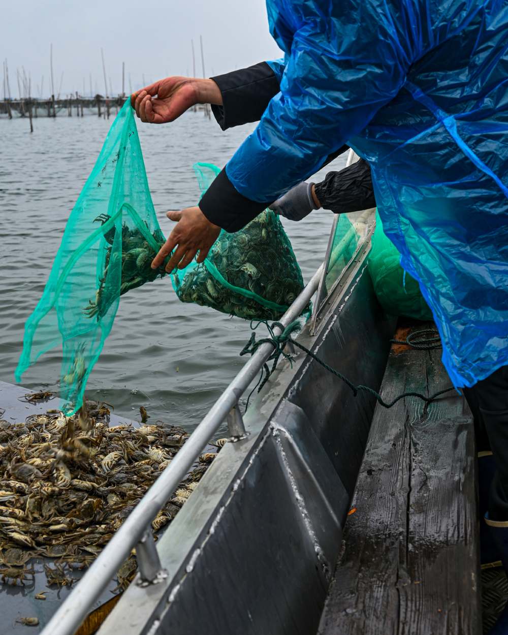 在阳澄湖现代农业产业园中华绒螯蟹“阳澄湖1号”培育基地,工作人员一大早就开始从蟹苗塘里打捞起一筐筐大小不一、个头健硕的蟹苗送进基地工场,由三、四十名工作人员按规格、质量现场分拣、挑选,然后一只只装袋入筐,再称重加冰块搬运到早已等候在停车场上的运输车上。据负责人介绍,该工场每天多则上万斤,少则数千斤蟹苗都要装车运往阳澄湖周边的养殖池塘,“阳澄湖1号”蟹苗也成为当地养殖户抢手的“香饽饽”。