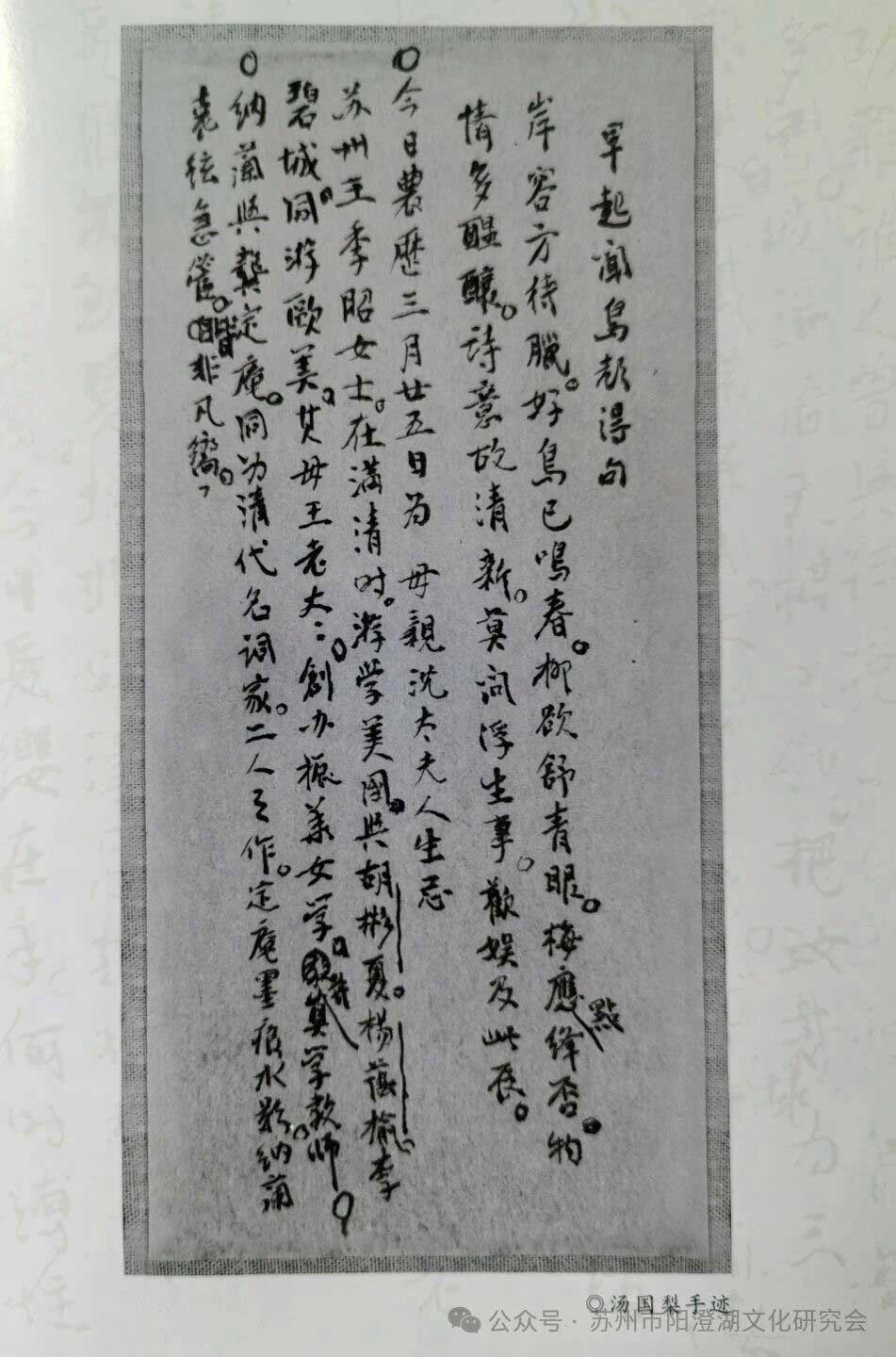 作《苏游杂诗八首》时,是1932年秋,汤国梨先生还未从上海迁居苏州,但已经流露出对住在苏州的向往和期待,更令人想不到的是,吸引她到苏州定居的是美味的阳澄湖蟹。以至于后来,她又陆陆续续写了十数首关于持鏊对菊的诗词,如“阳澄湖蟹许重尝”、“天平红树烂朝晖,霜落澄湖紫蟹肥”、 “漫说阳澄湖蟹好,秋来只对一篱花”、 “澄湖蟹好羞囊涩,莼菜鲈鱼岂易求”、“澄湖湖水清且湍,澄湖有蟹大如盘”,这些咏蟹诗中,有的直接点出“阳澄湖”,有的则简称“澄湖”。自明代沈周家族居住在阳澄湖边以来,尚未有哪一位诗人写过如此多咏阳澄湖蟹的诗,从某种意义上说,汤国梨先生乃是阳澄湖蟹的第一代言人。