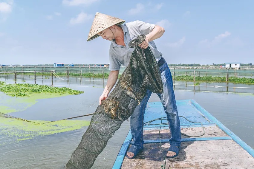 近年来,随着科技不断进步,大闸蟹养殖模式已由天然繁殖转变为基地人工繁殖。“蟹宝宝经过9至10个月的精心培育,生长成扣蟹,再经过7至8个月的湖区网围和高标准改造池塘喂养,就能成熟上市。”蟹农说,为了保证品质,当地采用生态养殖,为大闸蟹投放玉米、小鱼小虾和螺蛳等进行喂养。“我们每天都会去湖上巡查,特别是高温天气,如果发现水里缺氧,会采用微孔增氧方式保证阳澄湖大闸蟹的正常生长。水里氧气充足了,水草才能生长得好,水质才能得到净化,螃蟹也才能长得更好。”