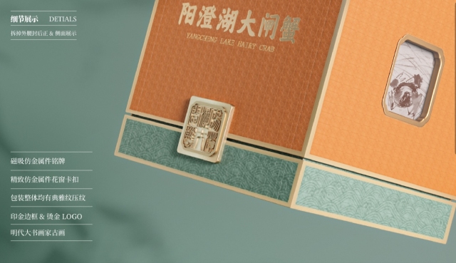 活动现场,阳澄湖大闸蟹全链路品质保障体系首度完整呈现。在专用包装发布环节,苏州市阳澄湖大闸蟹行业协会秘书长陆彬为大家介绍道,阳澄湖大闸蟹专用包装高端款采用玉玺式上下结构设计,中端款与普通款则创新可折叠结构,均融入苏州园林海棠花窗造型与乾隆榜书字体,蟹壳红、蟹青、至尊金的色彩搭配贯穿全系产品。包装扣设计同样精妙——高端款专属仿金属磁吸印章扣呼应玉玺主题,中端款便捷式卡扣沿用整体色彩体系,所有包装扣均与防伪标贴形成双重保障,筑牢正品防线。