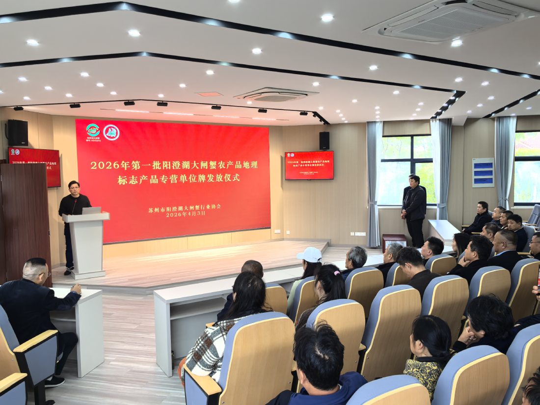 4月3日下午,苏州市阳澄湖大闸蟹行业协会在报告厅举行2026年第一批阳澄湖大闸蟹农产品地理标志产品专营单位牌发放仪式,仪式由协会秘书长陆彬主持。协会2026年轮值会长张全根为第一批经协会审核通过的40家会员单位颁发了阳澄湖大闸蟹农产品地理标志产品专营单位牌,并一起合影留念。