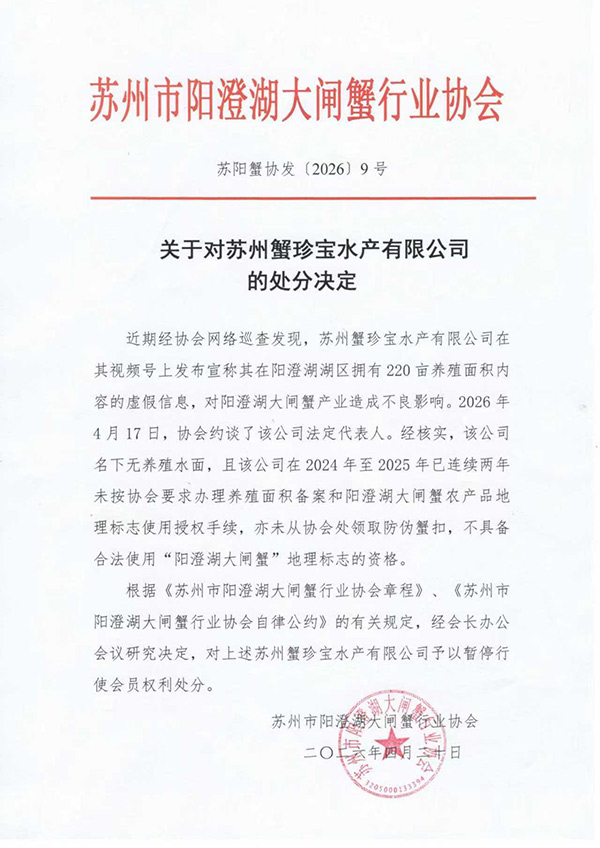 2026年,苏州市阳澄湖大闸蟹行业协会将持续贯彻落实市委、市政府关于《2025年阳澄湖大闸蟹产业发展和品牌提升工作方案》的决策部署,全力推动阳澄湖大闸蟹产业高质量发展,全力守护好“阳澄湖大闸蟹”金字招牌。因此,正确规范宣传企业产品,维护好阳澄湖大闸蟹品牌形象是我们每个会员义不容辞的职责,也是我们坚守的底线。近期,协会在网络巡查发现,有个别会员企业在宣传产品时多次出现夸张、虚假的宣传内容,违反了《苏州市阳澄湖大闸蟹行业协会章程》、《苏州市阳澄湖大闸蟹行业协会自律公约》等相关规定,经协会会长办公会议研究决定,对苏州蟹珍宝水产有限公司予以暂停行使会员权利处分。
